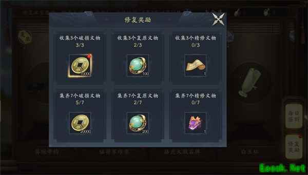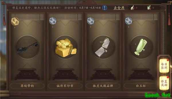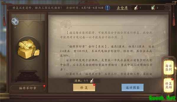 在修复的过程中,玩家可以通过考古笔记一点一滴的完善,与国宝对话,触摸历史的温度,深入了解文物背后所承载的三国文化。修复文物活动最后,游戏将改变原本的“出售”按纽,变更为“归还博物馆”,向玩家传达响应国家号召,妥善保护文物的正确价值观。当然,游戏内的文物数字影象将永久存入游戏内文物展柜供收集者瞻仰。此外,玩家参与修复还可获得丰厚的游戏道具奖励哦。