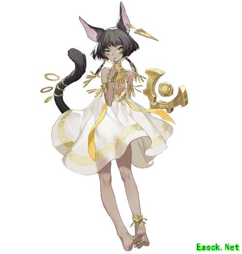 【贝斯特】 【职阶】权杖(法师) 【故事背景】神话溯源:贝斯特(Bastet),即埃及猫神,是古埃及神话中主管人间性爱的女神。有着月亮的温暖和女性的魅力。她的膜拜最早呈现在埃及第二王朝。她的化身是一只猫,人们赞赏她的敏捷和力量。她有动人的微笑,带给人们音乐、舞蹈和爱。夜间她伸展着猫儿一样的娇媚身姿和月光般动人目光。她最初的形象是狮神塞赫美特(Sekhmet),是太阳神拉之女,曾奉拉之命下界去毁灭罪恶累累的人类。因为过于残暴,拉不忍心看到人类受苦,于是取走了塞赫美特的“狂野”与“憎恨”,换成了“关爱”和“善良”。并使其逐渐也由狮子转化为猫,更名为猫神贝斯特。其化为狮子的形象时代表的是复仇和毁灭,其化为猫的形象时代表家庭、幸福和快乐。她的双面性更像是天使和魔鬼的两面性潜在的诱惑。 【性格特征】傲娇,可爱,猫系少女。非常慕强,崇拜强者,鄙视弱者。如果敌人在战斗时表现出强大的战斗力,即使被打得很惨也会认可对方。对一切毛茸茸都有无法抵御的热爱。喜欢欺负犬系男,尤其是阿努比斯。对涂山的九条大尾巴充满热爱。似乎更喜欢和小姐姐黏在一起。内心深处一直希望能找到“可以回去的地方”,即“家”的存在。但是,因为怀有期盼就会失望,所以表面上不愿意承认这一点。 【神器设定】叉铃:狂野回声。贝斯特虽然是法阶但是偏向于近战,敏捷较高,带点刺客的感觉。神器看起来像逗猫玩具一样,会发出清脆铃声的小小装饰品,会发出各种带有声音的投掷物,经过投掷物时会有一束光砸下来从而造成巨额伤害。大招则是通过逗猫棒召唤巨型猫猫球造成爆炸伤害。贝斯特最独特的一点则是在赶路时会坐上自己的猫猫球进行快速移动。