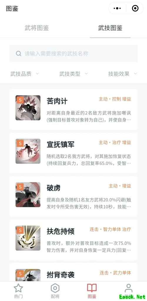 【武技图鉴】版块可了解所有武技的效果和属性,通过武技品质、类型、技能效果选项,便可筛选出相应的武技。此外,搜索栏的使用方式与【武将图鉴】一致哦~