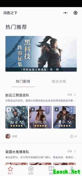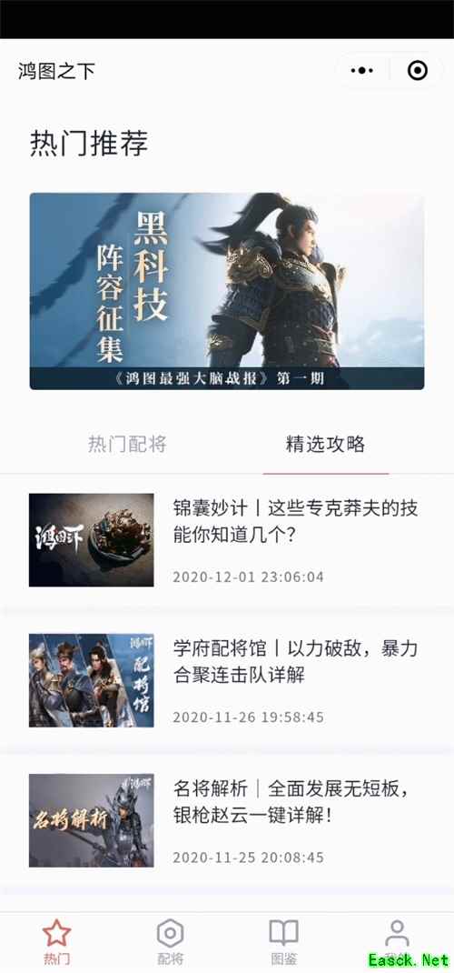 若主公来自企鹅区,可以在企鹅中搜索关键词【鸿图之下小程序】,即可进入企鹅区专属小程序哦~ 02【热门推荐 精彩纷呈】 【热门】区域中共包含两大版块 – 热门配将&精选攻略 【热门配将】版块将实时推送热门阵容搭配,同时置顶关注度最高的配将方案。