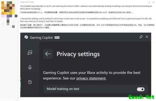 一位ResetEra用户发现,微软新版Gaming Copilot AI正在将用户游玩内容的屏幕截图与录制视频传回微软服务器。这款AI助手会自动安装在Win11电脑上,微软将利用这些数据进一步训练其AI模型。该设置默认处于开启状态,这意味着除非用户手动关闭,否则微软将持续利用玩家的游戏时间训练AI。