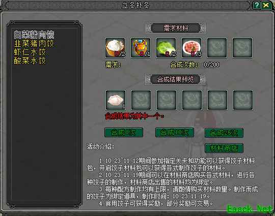 【三味盛宴】菊花酒+桂花糕+立冬饺 时间:10月23日-11月12日(兑奖至11月19日) 共饮菊花酒:闯副本集糯米、茱萸,换各式美酒,饮美酒得脉气、坐骑券、龙隐石! 丹桂飘香:百花袋开桂花与糯米粉,兑桂花酒与桂花糕,随机开出六星战印、兵魄洗炼石(7级)! 立冬补冬:包饺子吃福利,白菜饺、虾仁饺、酸菜饺任选,可选“2.5倍经验”模式,灵活培养!。