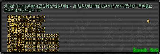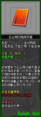 【新服惊喜】新服挑战 时间:10月23日-11月12日(领奖至11月19日) 云山同归:新服专属挑战手册,活动时间完成挑战可领六星战印、大真武魂石!