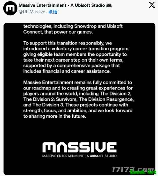 育碧旗下知名工作室Massive Entertainment今日发布官方公告,宣布为优化长期发展规划与资源布局,将对团队进行重组,并推出一项“自愿职涯转换计划”,以自愿离职的方式裁撤部分员工。