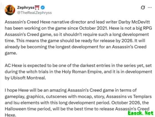 育碧新作《刺客信条:Hexe》将是系列最黑暗作品!有望2026年万圣节发售