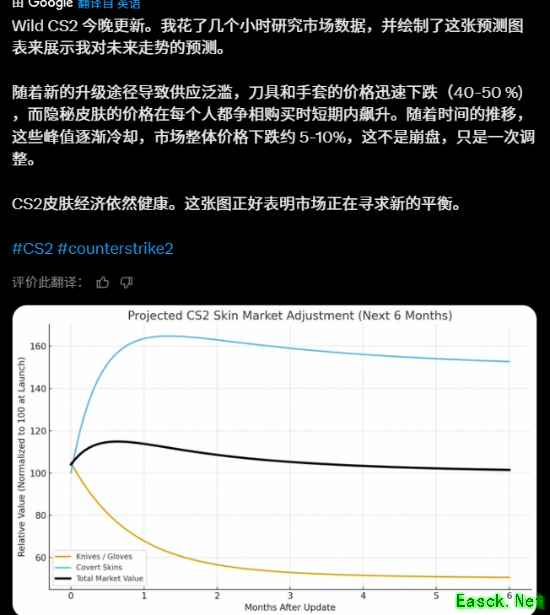 前YouTube高管Fwiz在社交媒体上批评道:“这次更新简直是Valve对社区的‘地毯式撤资’。现在玩家只需用价值5美元的皮肤,就能换出原本要价上千美元的刀具。整个市场被洗劫一空,持有高价饰品的人全都被套牢了。” 不过,也有观点认为影响被夸大。交易平台CSFloat公布数据称:“目前大约有2000万件隐秘皮肤(不含刀具和手套)。即便所有低级皮肤都被汰换成隐秘皮肤,最多也只会新增约900万件。在最极端的情况下,若所有2900万隐秘皮肤都用于汰换,刀具和手套的总供应量将从550万件增至约1100万件,翻倍而已。但现实中这种情况几乎不可能发生。”
