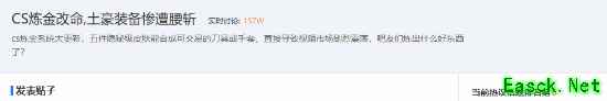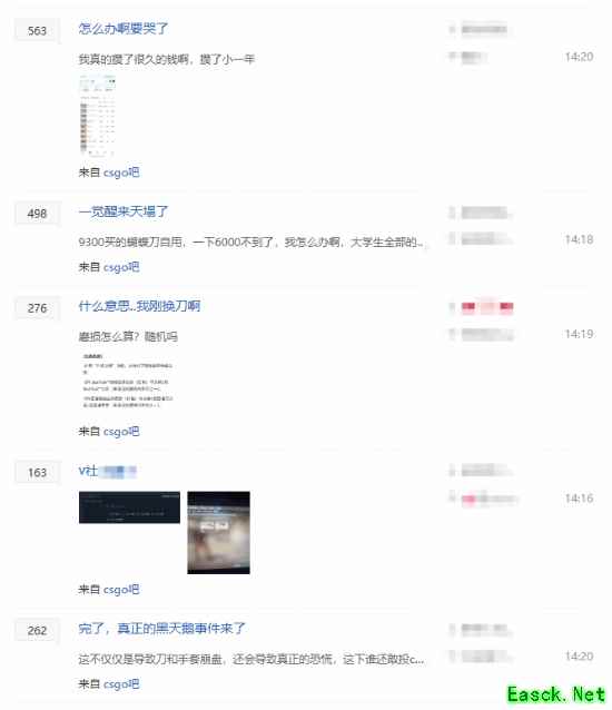 由于系统大改后致使刀具与手套更易获得,导致很多玩家已拥有刀具与手套的价格崩盘,例如蝴蝶刀和运动手套等。截至发稿前,“CS炼金改命,土豪装备惨遭腰斩”词条登上了贴吧热议榜,引发众多玩家热议,很多玩家晒出自己的盈亏图进行了吐槽。