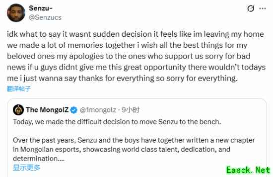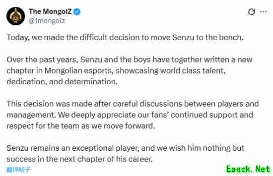 蒙古战队The MongolZ官方今日在推特宣布,旗下选手Senzu将调整至替补席位,并表示这是一项艰难的决定。