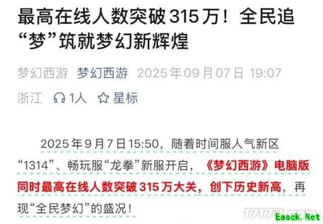 根据近期官方公布的最新数据,今年9月7日,在隔壁800万勇士的助力之下,《梦幻西游》最高在线人数突破315万,创下历史新高。