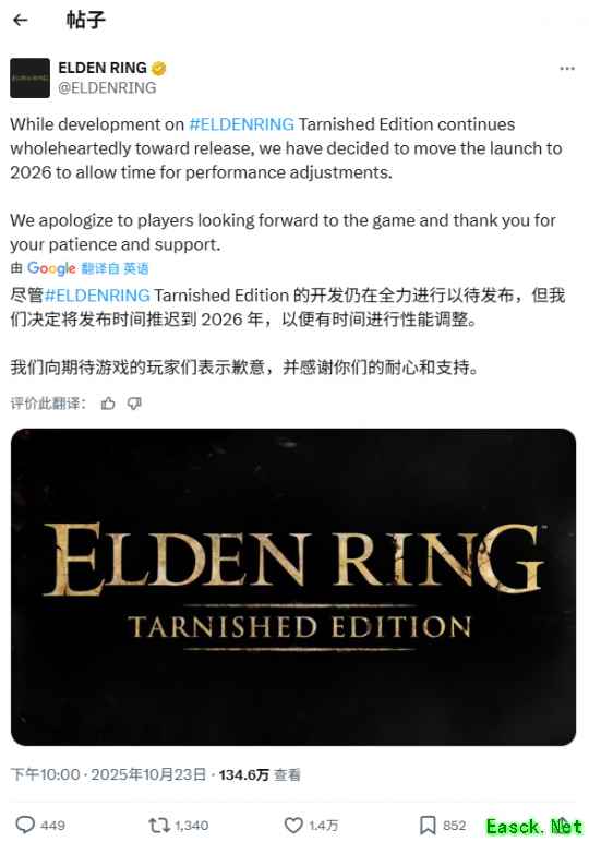 FS社与任天堂官方确认,《艾尔登法环:褪色者版》(Elden Ring: Tarnished Edition)在Switch 2平台的发售时间将从原定的2025年延期至2026年。官方在公告中表示,延期是为了“确保游戏在性能上的充分优化”,并对玩家的等待致以歉意。