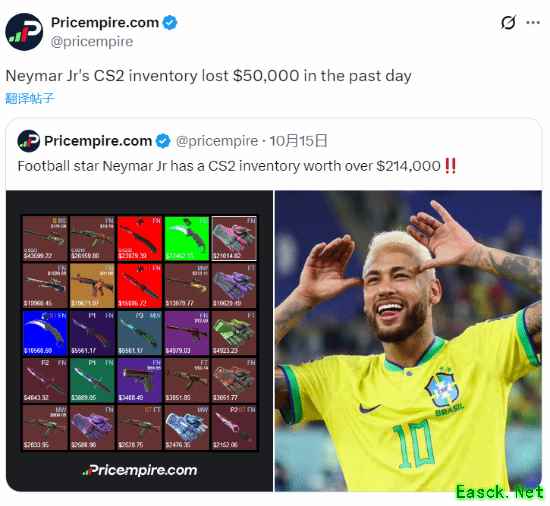 为直观展现此次损失的规模,就连名人也未能幸免。据PriceEmpire披露,巴西球星内马尔个人的《CS2》饰品库存仅在过去24小时内缩水约5万美元。