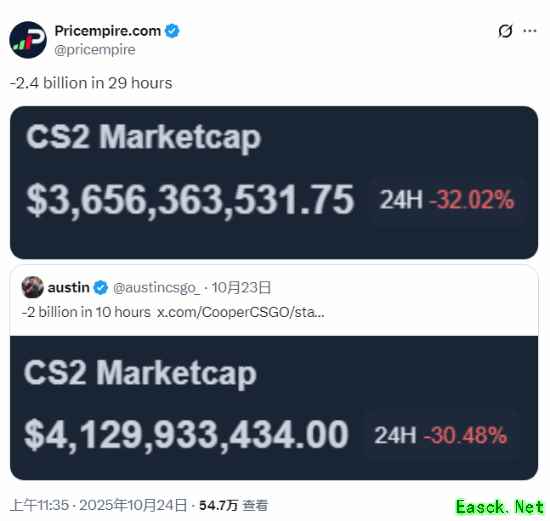 《反恐精英2》的虚拟经济体系正经历着有史以来最猛烈的一次崩盘。根据PriceEmpire的数据显示,在过去的29小时内,《CS2》饰品市场的总市值从约60.6亿美元暴跌至36.5亿美元,短短一天多的时间里就蒸发了约24亿美元(约合人民币170.9亿元),跌幅最高时达到39.6%。