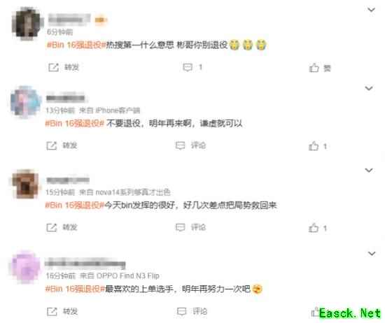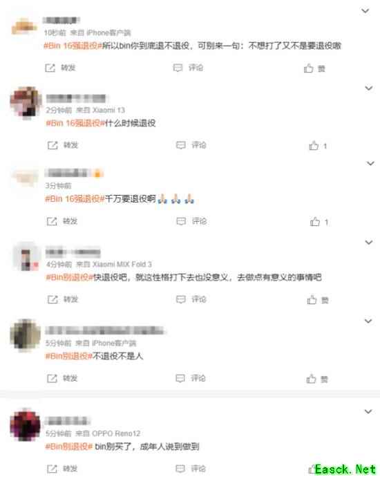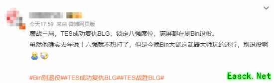 由于Bin曾说过“如果真止步16强,明年就不打了”的言论,截至发稿前,“Bin 16强退役”“TES战胜BLG”“Bin别退役”等相关词条登上了微博热搜,网友们对此进行了讨论。对于此事,网友们的看法不一,大多数网友支持Bin退役,也有一些网友挽留Bin。