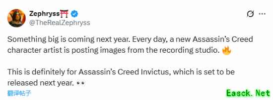 推主@TheRealZephryss今日发文说道:“近期《刺客信条》的多名演员都在分享自己在录音室的动态,明年或许要有大事发生,肯定与《刺客信条:Invictus》有关。”从图片里可以看到,有艾沃尔的演员以及艾雅与巴耶克的演员。