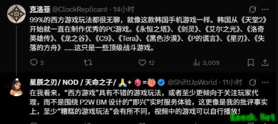 近日,海外游戏社区一篇关于韩国游戏优缺点的帖子引发玩家热议。 推主@ShiftUpWorld指出,如今绝大多数韩国游戏都在视觉效果上投入巨大,通过性感角色和精美美学吸引玩家,但游戏玩法却缺乏深度,套路单一,许多以微交易为主要盈利手段的作品几乎如出一辙。