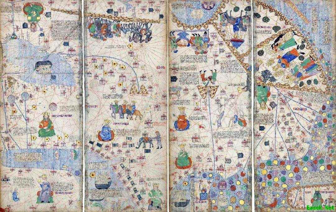 《加泰罗尼地图集》,最著名的波特兰型海图之一 《比萨航海图》大约在公元13世纪出现,在这之前人类根本没有专业的航海图,即便要绘制海图,能够参考的也不过是一些海员日记之类的资料。 但波特兰型海图却是相当精准的,哪怕是与今天的地图相比,地形的偏差也非常小,尤其是涉及当时航路繁茂的地中海、红海等区域,所绘制的海岸线、港口的数量和形状与现代航拍出来的照片也相差无几。