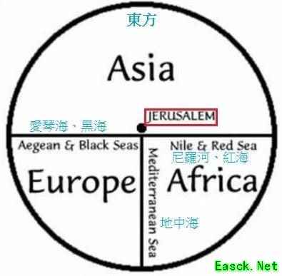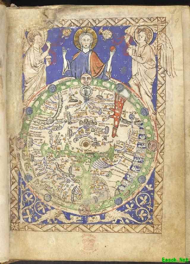 《比萨航海图》 在波特兰型海图问世之前,在欧洲盛行的是一种名为T-O地图的世界古地图,这种地图特征非常明显,都是以耶路撒冷为地图的中心,以伊甸园所在的东方为地图的上方。陆地则分为欧亚非三大洲,分隔三者的河流或海洋呈『T』字形,外圈则被『O』字形的大海所包围。