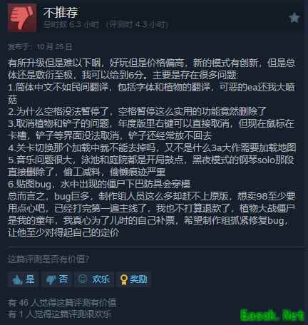 点击进入游民众评查看详细评价数据>>> 在《植物大战僵尸:重植版》Steam商店页面国区的评价区里,很多玩家吐槽游戏的Bug太多,且玩法不平衡,原版一些备受喜爱的功能被移除,音效也进行了阉割,不值98元的定价。 部分好评评价: