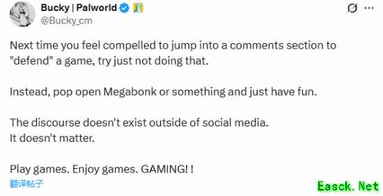 据外媒gamesradar报道,《幻兽帕鲁》开发商Pocketpair的传播总监兼发行经理John 'Bucky' Buckley日前在推特向玩家们提了一些建议——劝玩家们别互喷,玩自己喜欢的游戏就够了。