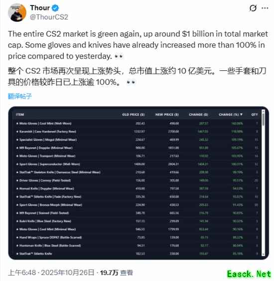 据专注于《反恐精英2》的推主@ThourCS2发布的推文报道,由于不明原因,《反恐精英2》的市场突然全线上涨,总市值增长约10亿美元,部分手套和刀具价格较昨日涨幅已超100%。@ThourCS2还补充称,如果玩家正在考虑退出市场,这次市场拉升或许是个不错的时机。