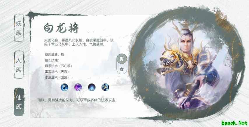 【仙族】法术攻击型:仙人经过多年修炼而超脱肉身的限制,因此法力无边,具备呼风唤雨的能耐。仙族不擅长使用野蛮的武器进行攻击,善于利用大自然的灵气做为自己的攻击手段,即使用大自然中的风、火、雷、水。一个得道的神仙能够使出威力无穷的灵气攻击,毁灭周围一切,给对手造成巨大的法术伤害,同时伤害多个对手。
