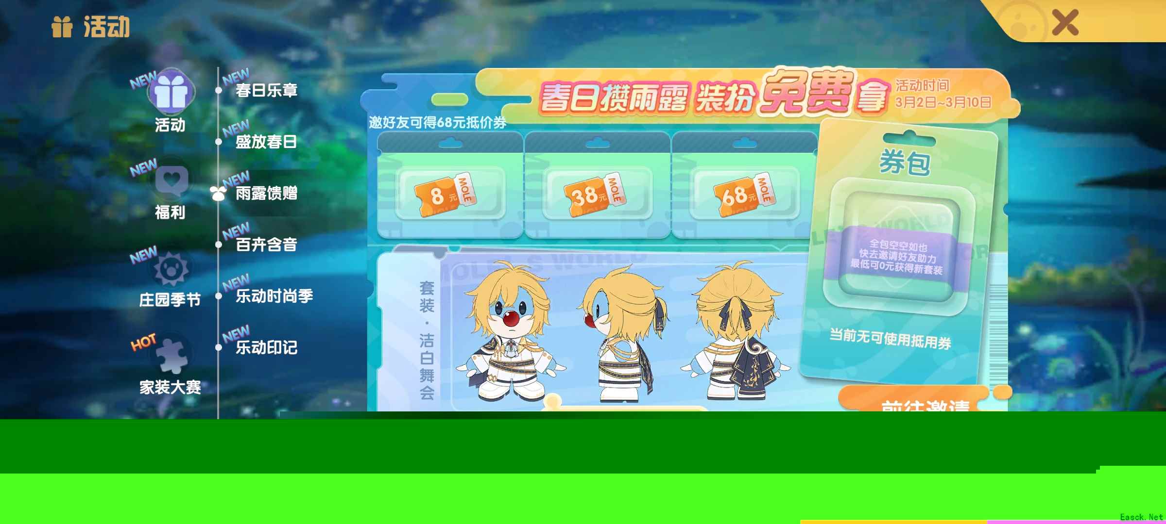 3. 雨露馈赠活动中,洁白舞会装扮的兑换时间将于3月16日23:59截止,还没兑换的小摩尔千万不要错过时间呀!