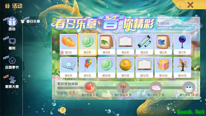 二、庄园大事件 活动结束提醒 1.春日乐章签到活动将于3月15日23:59结束,还没领取乐动闪亮灯球、夹心棉花糖蹦床、青月鹭幼崽的小摩尔要抓紧时间啦! p.s.消耗金豆可以补签哦~