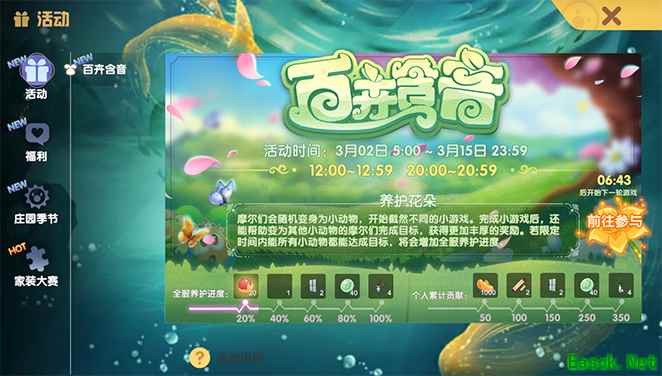 2. 百卉含音活动将于3月15日23:59结束,活动小游戏将在15日当晚20:00-20:59最后一次开放,小摩尔们别忘了领取个人累计贡献、全服养护进度的奖励哦~