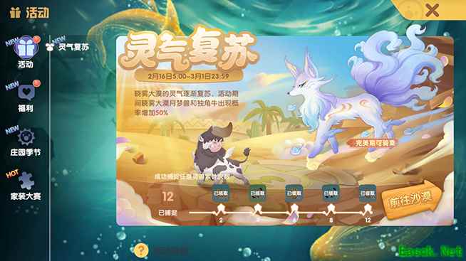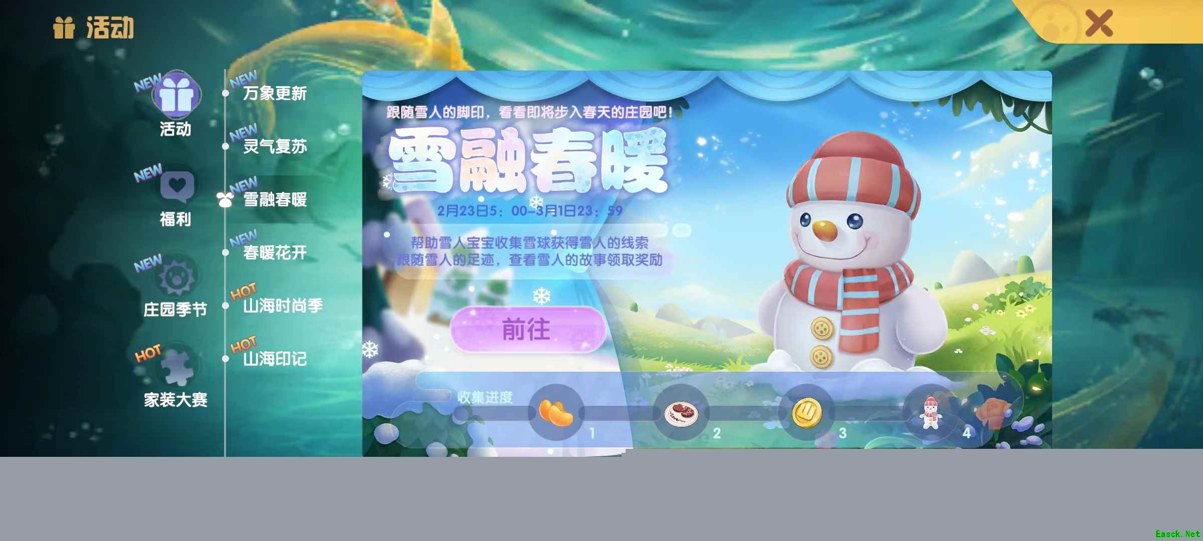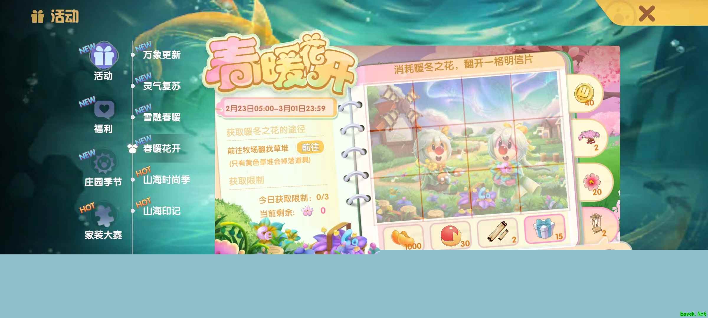 晴天夜晚,新传说鱼将现身迷雾沼泽! 将星云装入水晶球带到庄园,陨夜鲸送你宇宙级的浪漫~ 二、庄园大事件 活动结束提醒 1.灵气复苏、雪融春暖、春暖花开等活动将于3月1日23:59结束,快快抓住节气的尾巴~