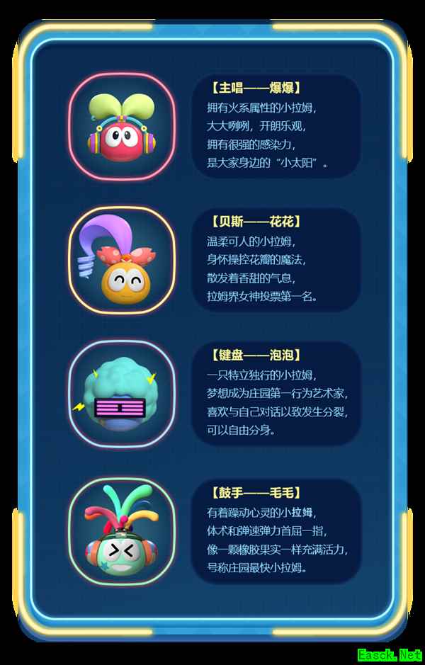 新裤子在舞台上嗨翻全场的表现力,让现场的小摩尔深受震撼。如果能让新裤子来庄园开音乐节,那绝对是大场面! 于是,摩尔特工带着拉姆小队一起找到了新裤子,邀请他们作为明星嘉宾助阵摩尔庄园里的演唱会! 新裤子和拉姆乐队会碰撞出怎样奇妙的火花呢?让我们一同期待,六一手游上线时新裤子和拉姆乐队的正式MV! 拉姆乐队 “站在最耀眼的舞台让你看见!” 这是拉姆乐队的宣言,也是拉姆乐队成立的初衷。他们为了准备好公测的开园庆典,正在接受新裤子的魔鬼集训呢~ 可能大家对这四只小拉姆还有些陌生,艾米在这儿隆重地介绍一下:
