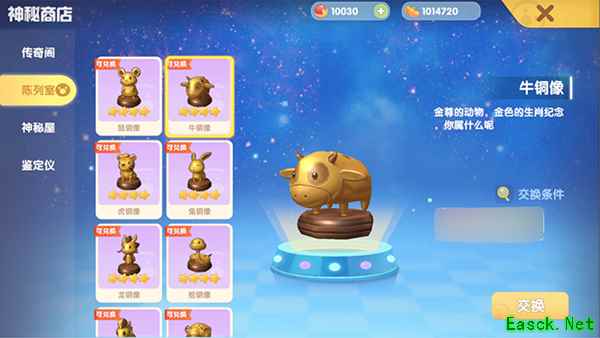 陈列室: 陈列室主要为铜像系列家具,都是非常有质感的金属装饰品,目前有十二生肖系列和摩汉系列。 兑换条件:需要特定材料,可以通过日常采集获取,获取几率较小。