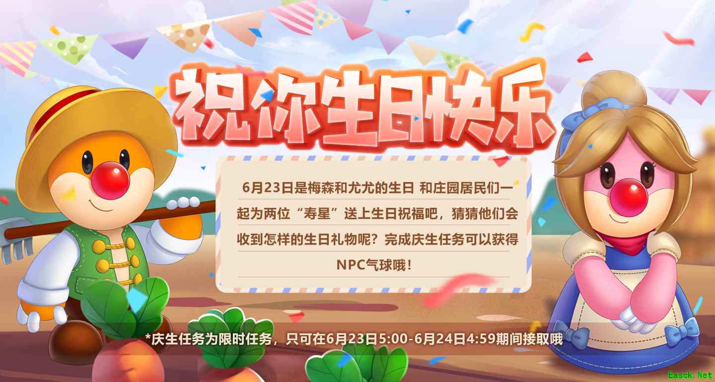 6月23日5:00-6月24日4:59期间,小摩尔们可以在庄园接取梅森和尤尤生日相关的限时任务,完成任务后,可以获得梅森和尤尤的专属气球装扮哦~