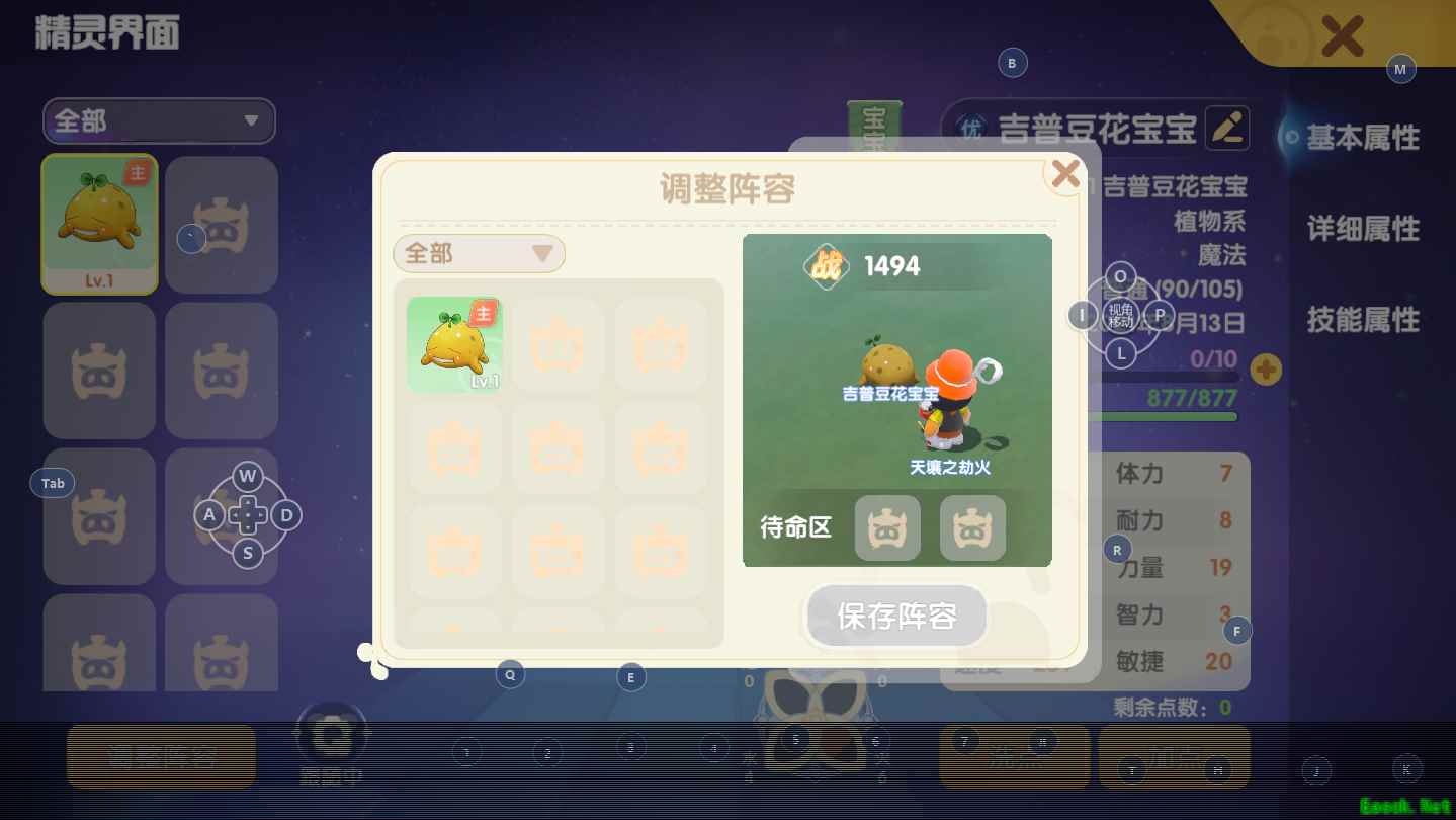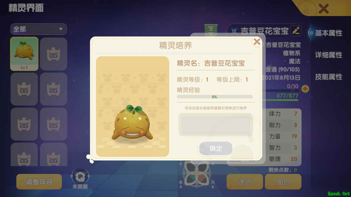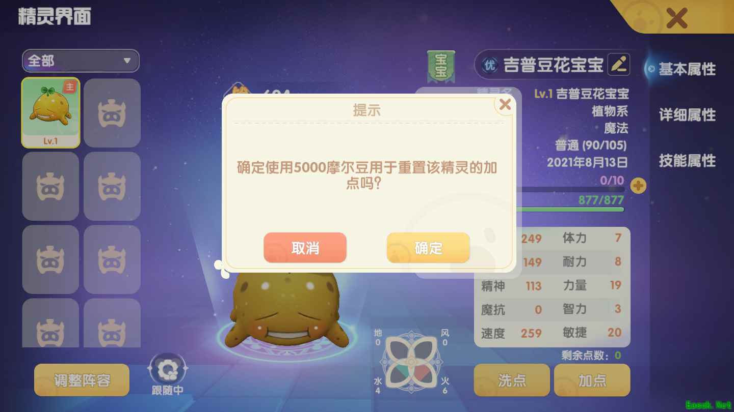 精灵升级后可以点击“加点”按钮分配属性点,在右边基础信息中可以看到精灵的偏向,加点一般是根据精灵的偏向来决定。如果加点错了可以使用旁边的“洗点”功能为精灵重置属性点。 右下角可以看到精灵的属性,本作的属性关系为火→风→地→水,在对阵不同属性的敌人是可以随时调整出战的精灵阵容。