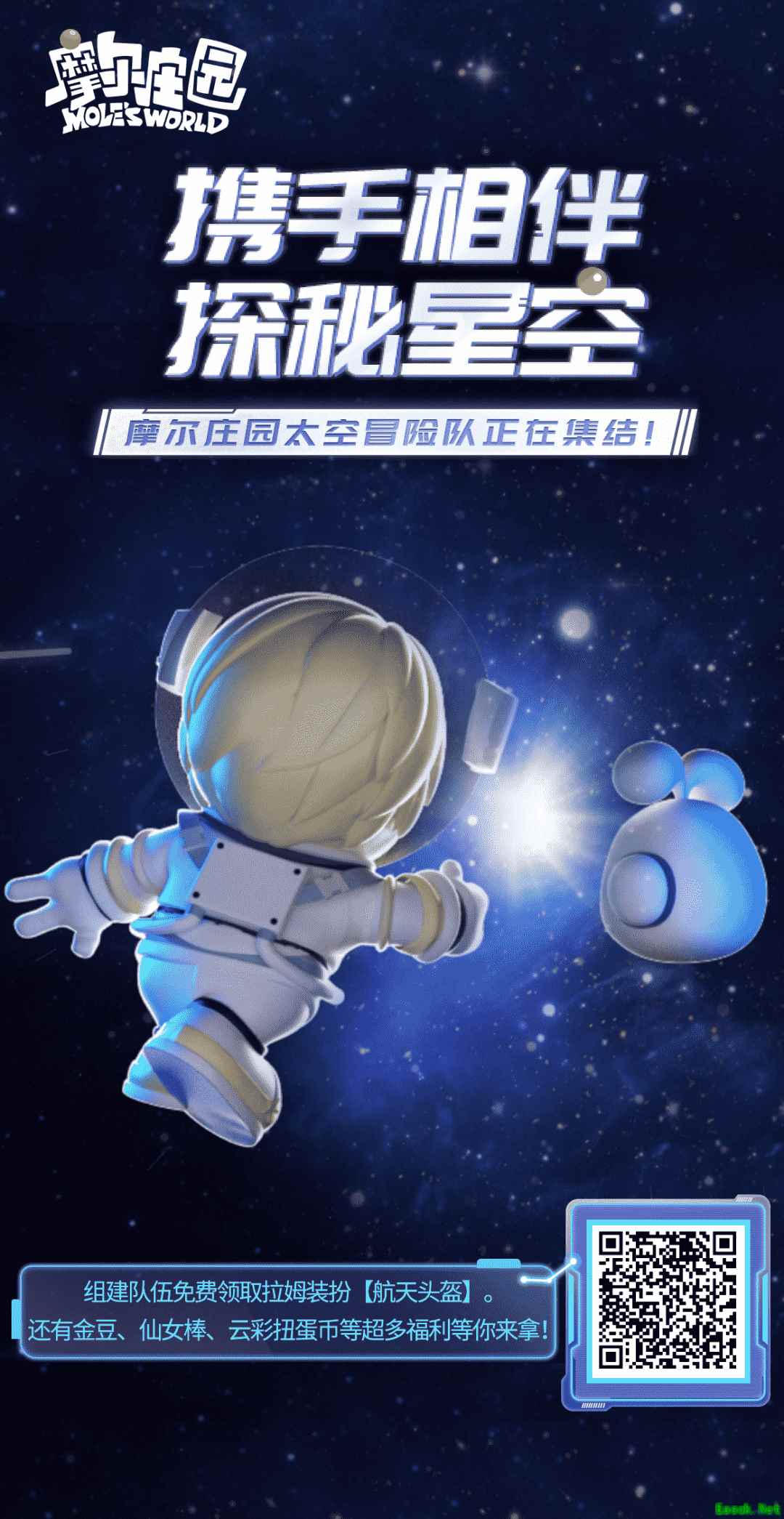 小摩尔们好,庄园正集结太空冒险队探秘星空哦! 一、太空冒险队组队集结 太空冒险队速速集结!从07月08日10:00起至08月24日23:59,达成一定集结数量就能免费获得云彩扭蛋币、金豆、拉姆装扮【航天头盔】等超多精彩福利! 除此之外,每日登录活动界面都可以抽奖一次,组队集结还可获得额外抽奖机会哦! 快识别下图二维码参与活动吧,渠道服、官服玩家皆可。