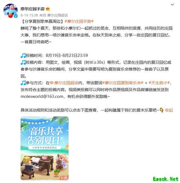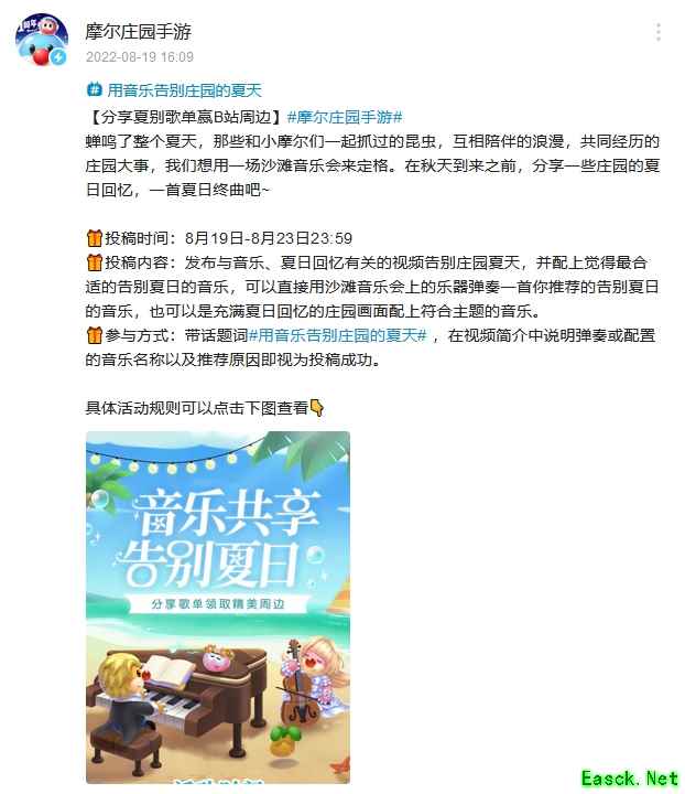 2、近期活动汇总 庄园最近有很多可以参与的活动哦,只需要分享夏别歌单就可以赢取精美周边。具体的内容已经为大家整理好了,家摩们快来官方微博和官方B站看看吧!