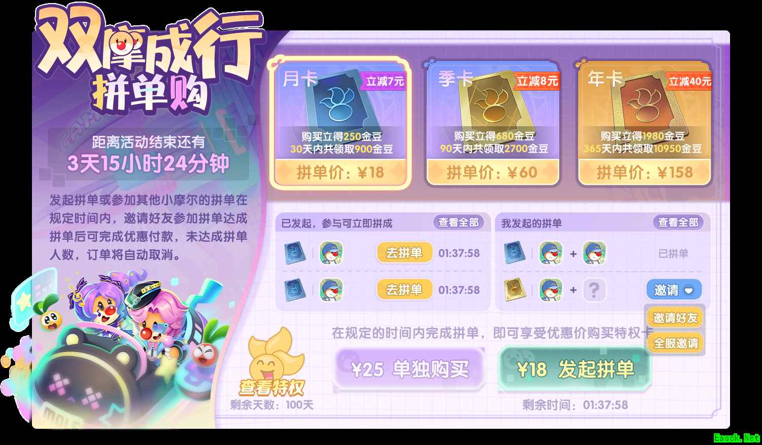 活动三:双摩成行拼单购 活动时间 11月10日更新后-11月16日23:59 活动奖励 优惠拼单购超拉月卡、季卡、年卡 活动期间,成功拼单购买超拉月卡、季卡、年卡,即可分别享受立减7元、8元、40元的折扣优惠 温馨提示:活动期间内每种超拉卡限购7张,以拼单价购买的超拉卡与正价超拉卡的奖励、特权一致哦。