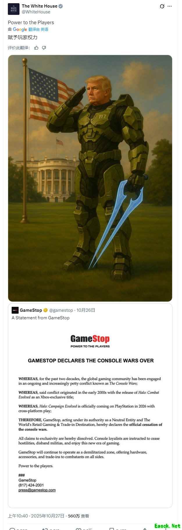 一场原本属于游戏圈的“战争终结”宣言,竟意外引来了美国白宫的“官方下场”玩梗。今日,白宫官方推特账号发布了一张AI生成的特朗普士官长图片,以此来回应几天前零售商GameStop发布的“主机大战正式结束”的声明。