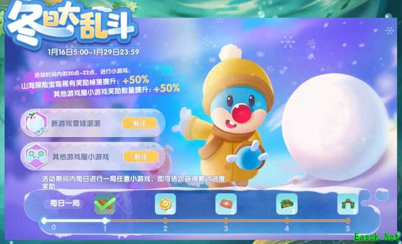 随着雪球滚滚上线,1月16日5:00-1月29日23:59会开启精彩的冬日大乱斗活动!活动期间的每天20点-22点,参与寻宝探险获得稀有道具的概率会提升,其他小游戏的奖励也会翻倍!
