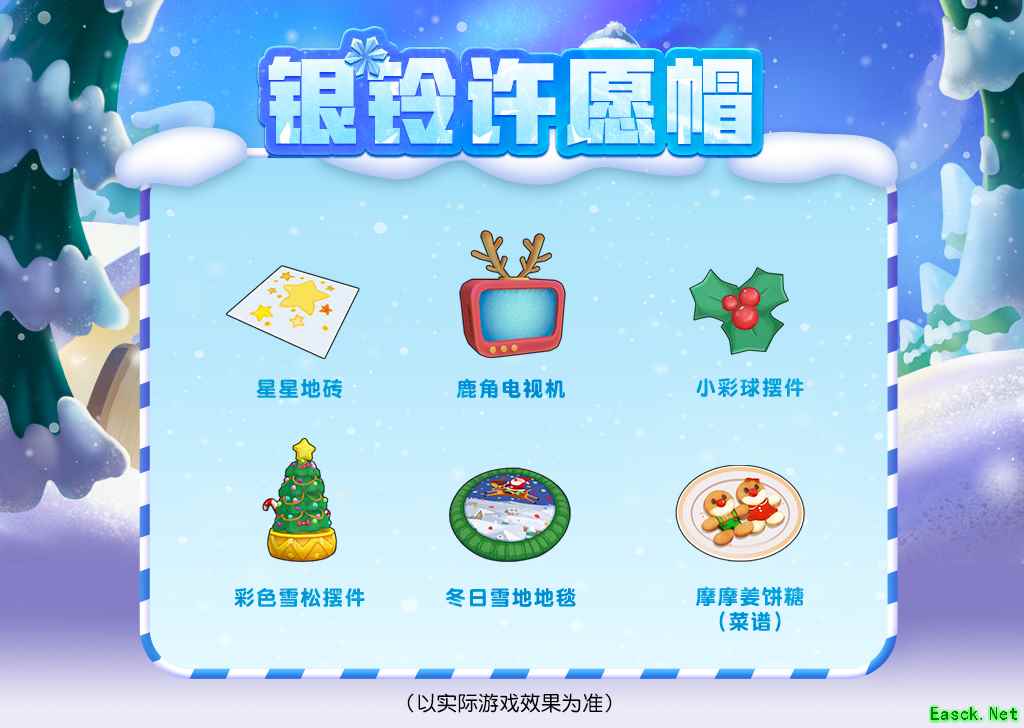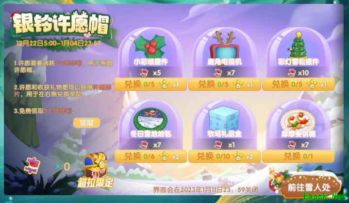 【银铃许愿帽】 活动时间: 12月22日更新后-1月4日23:59 活动介绍: 新季节,新气象,庄园里的雪人们也想要换上新的衣装。