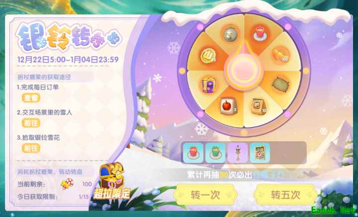 活动期间,完成指定任务即可收集道具「拐杖糖果」,使用「拐杖糖果」转动转盘,有机会获得银铃节家具,金豆及季节币等丰富奖励噢!
