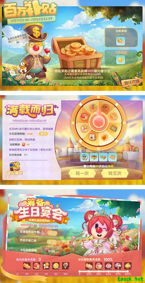 2、庄园大事件 活动下架提醒 叮叮叮,重要信息,穿越寻宝季活动将于11月24日04:59结束,各位小摩尔们快看看有哪些活动即将下架,避免错过。 百万金库、满载而归活动将在11月23日23:59结束,大家先去掏空大力老板的金库,再翻翻低调的摩尔的红包,确保一根羊毛都不漏下!另外,为生日宴会进行的筹备活动,也将在11月23日23:59结束,还没收集礼盒的小摩尔们,快快参与活动领取奖励吧!
