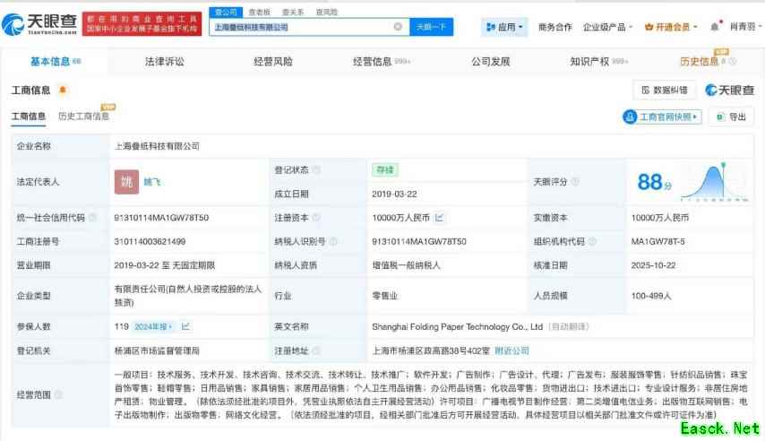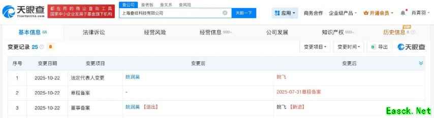 据天眼查App信息显示,近日上海叠纸科技有限公司发生工商变更,姚润昊卸任法定代表人与执行董事,改由姚飞接任。