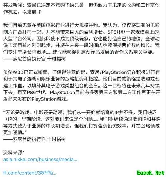 索尼对收购华纳兄弟没兴趣 专注于动画和游戏领域