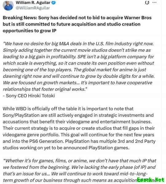 本月22日时,媒体报道了华纳兄弟探索公司以及旗下游戏工作室被挂牌出售的消息。据日经亚洲报道,索尼已经决定不会收购华纳兄弟探索公司,但未来仍然会继续收购和成立工作室,以发展其IP。