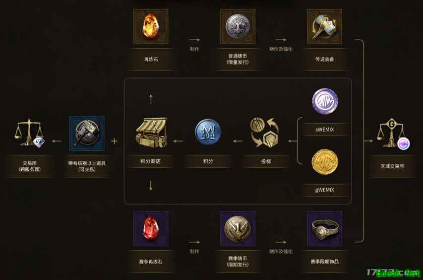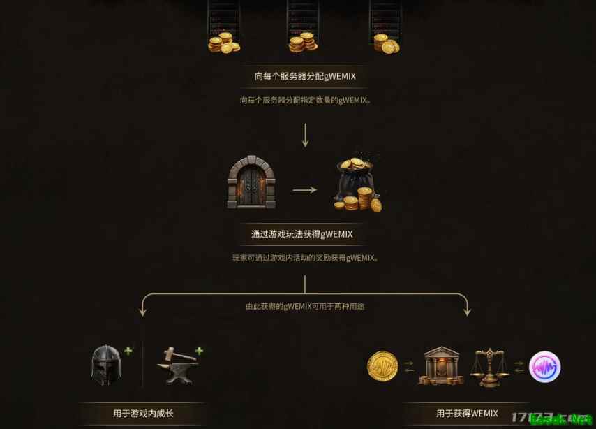 《尤弥尔传奇》以铸币经济为中心设计。核心铸币的材料只能在积分商店通过质押获得。区域交易所只能登记价值较高的道具,且WEMIX是唯一可交易货币。