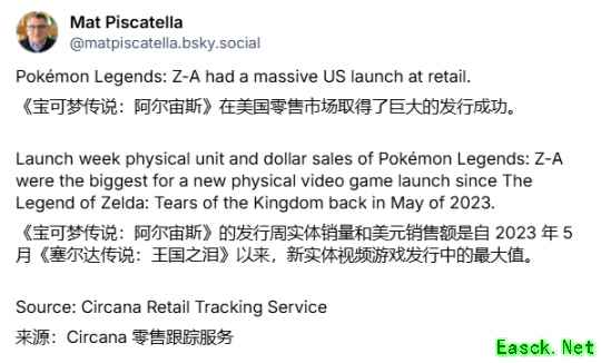 根据Circana分析师马特·皮斯卡泰拉披露的最新数据,《宝可梦传说 Z-A》在美国市场表现强劲,已成为自2023年5月《塞尔达传说:王国之泪》发售以来,该地区销量与销售额最高的实体版游戏作品。