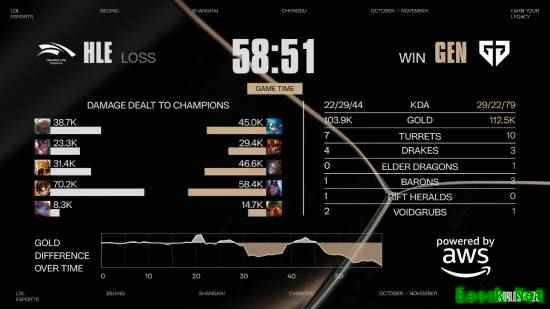 22分钟,Zeus雷克塞率先开团,但被Duro妮蔻大招反手控住四人,Ruler伊泽瑞尔拿下三杀,GEN完成二换五;