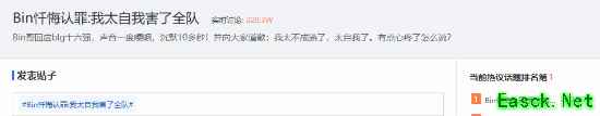 截至发稿前,“Bin忏悔认罪:我太自我害了全队”话题登上了贴吧热议榜的第一名,引来众多玩家围观,有玩家对陈泽彬表示同情与心疼,认为陈泽彬在此前比赛中的表现很是出色,说道:“明明去年全LPL成绩第一结果今年一直在被网暴,他除了张扬点也没做任何出格的事吧,和队友也没闹过矛盾,不懂为啥这么多人恨他。”