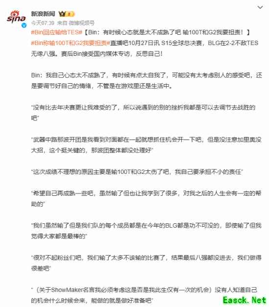 据新浪新闻报道,比赛之后,BLG上单选手陈泽彬(游戏ID:Bin)接受了国内媒体的专访,并对自己进行了反思。陈泽彬认为,自己的心态太不成熟,且有的时候表现的有点太自我。“这次成绩不理想的原因主要是输100T和G2太伤了吧,我自己要承担不小的责任。”
