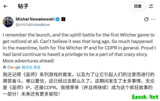 CDPR联席首席执行官Micha Nowakowski在社交平台发文表示:“我仍记得首作发售时的情景,以及为了让它被人注意到所经历的艰难过程。真难以相信那已经是18年前的事了。这期间,无论是《巫师》系列还是CDPR本身,都经历了巨大的变化。”